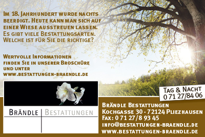 Seit vielen Jahrzehnten helfen wir Menschen in Pliezhausen, Kusterdingen, Walddorfhäslach und Altenriet, wenn sie uns brauchen, weil sie einen lieben Menschen verloren haben. Erfahren, kompetent und zuverlässig stehen wir Ihnen zur Seite, um Ihnen einen Abschied in Ruhe und Würde zu ermöglichen. Auf diesen Seiten möchten wir Ihnen uns und unsere Arbeit vorstellen. Gleichzeitig laden wir Sie herzlich ein, uns einmal in unseren Räumlichkeiten zu besuchen und persönlich kennenzulernen – nicht erst im Ernstfall.